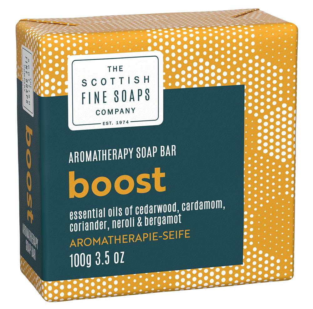 Revitalise yourself with this energising Boost Aromatherapy Soap Bar filled with magnesium and avocado oil. This vitamin rich bar is scented with mood boosting essential oils of cedarwood, cardamom, coriander, neroli & bergamot.